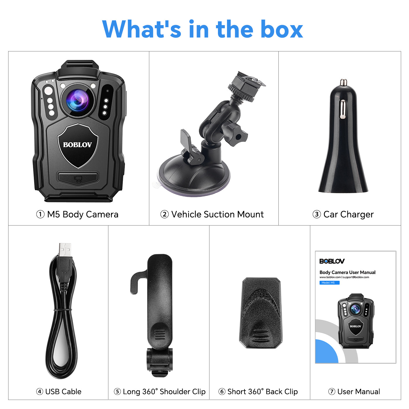 Complete Package: The M5 cops body cam for sale package includes a 64GB internal memory, USB cable, short 360° clip, long 180° clip, and user manual. BOBLOV provides a two-year warranty for peace of mind and reliable after-sales support.