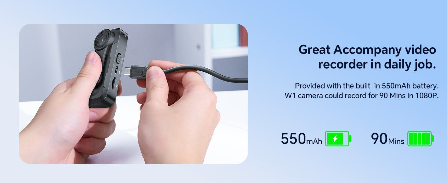 - W1 Body Camera with 100-Minute Recording Time: Powered by a 550mAh rechargeable lithium battery, the W1 camera provides up to 100 minutes of recording. Supports continuous use while charging. Connect it to a portable power bank for extended operation